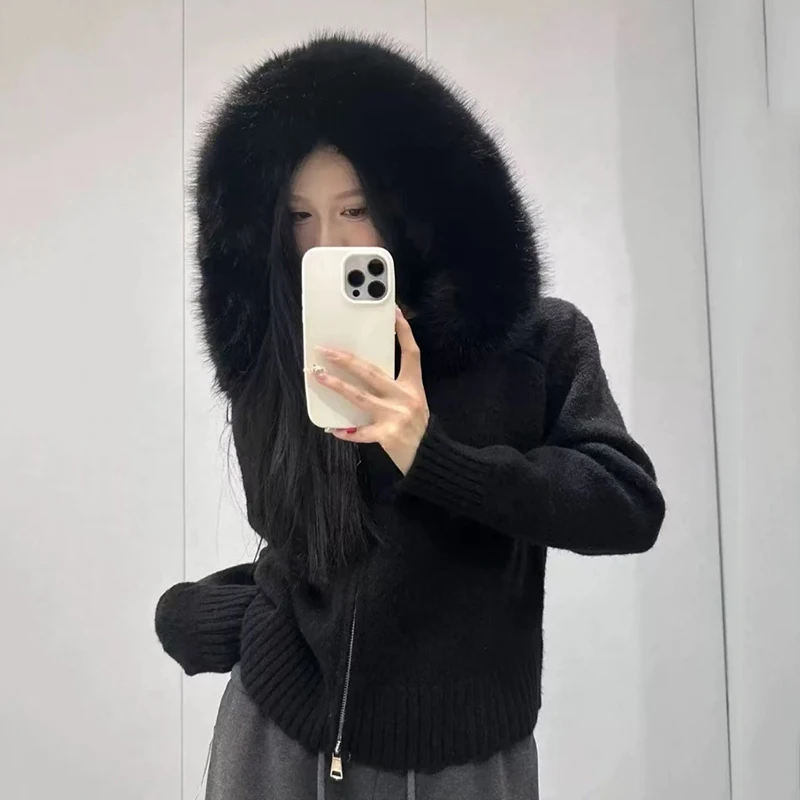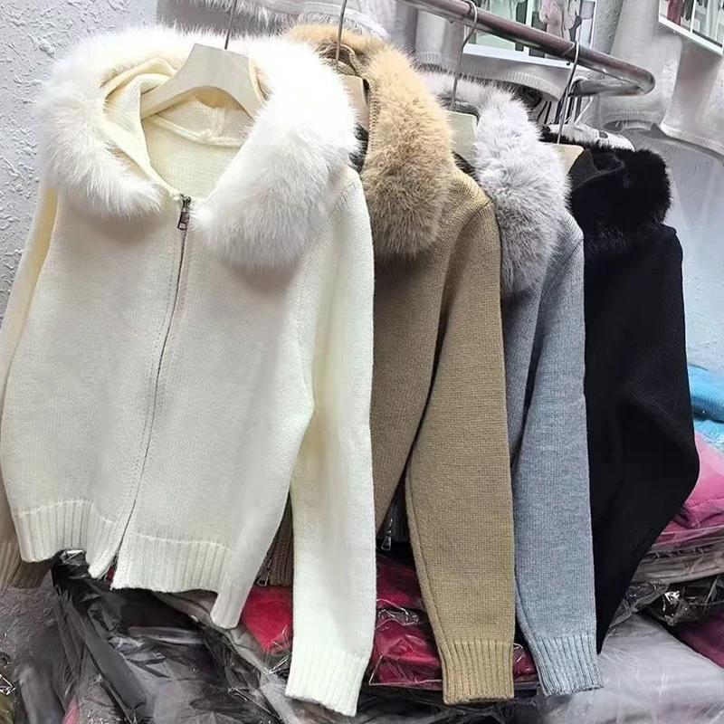 clothes type: fur collar knitted cardigans women/zipper up sweater coat woman