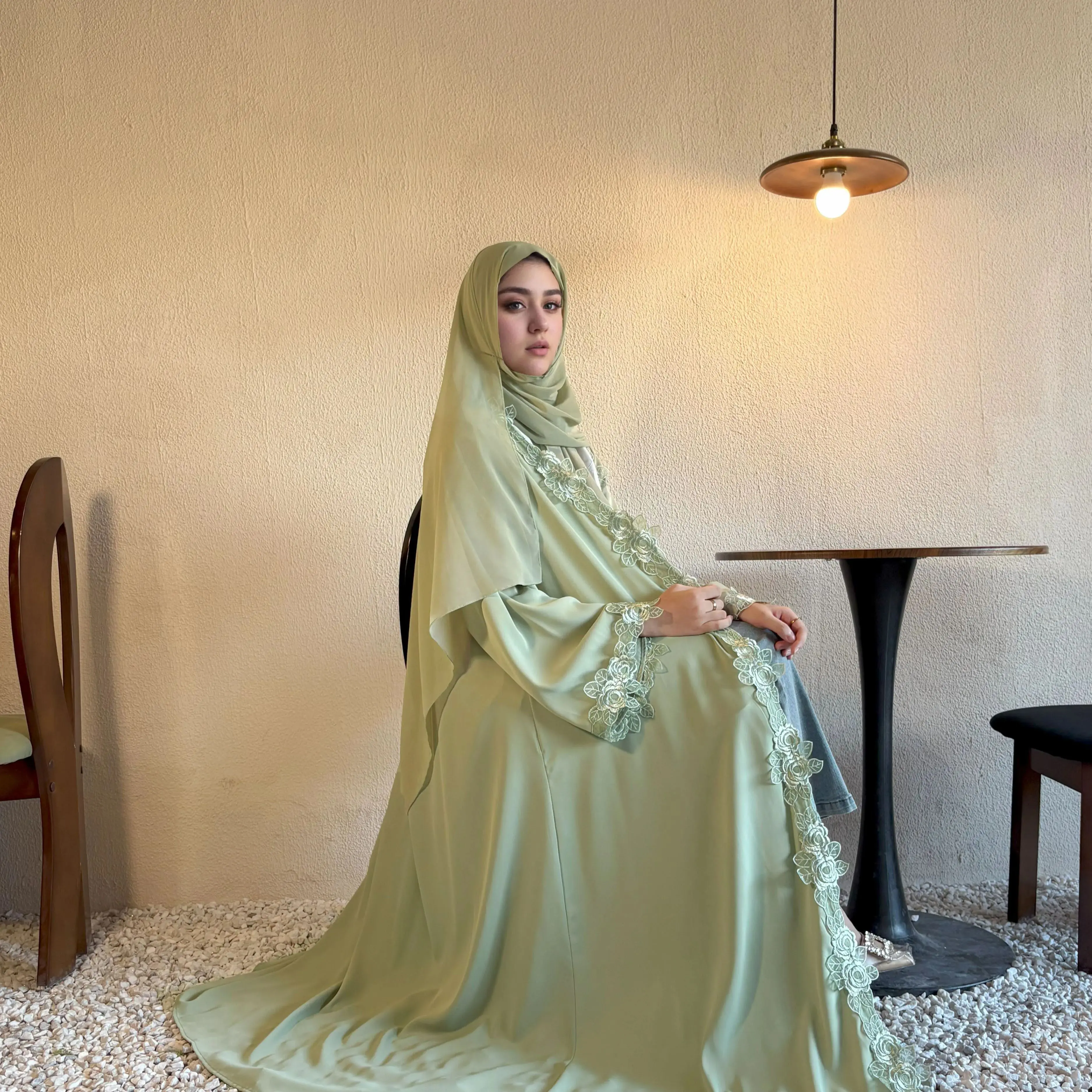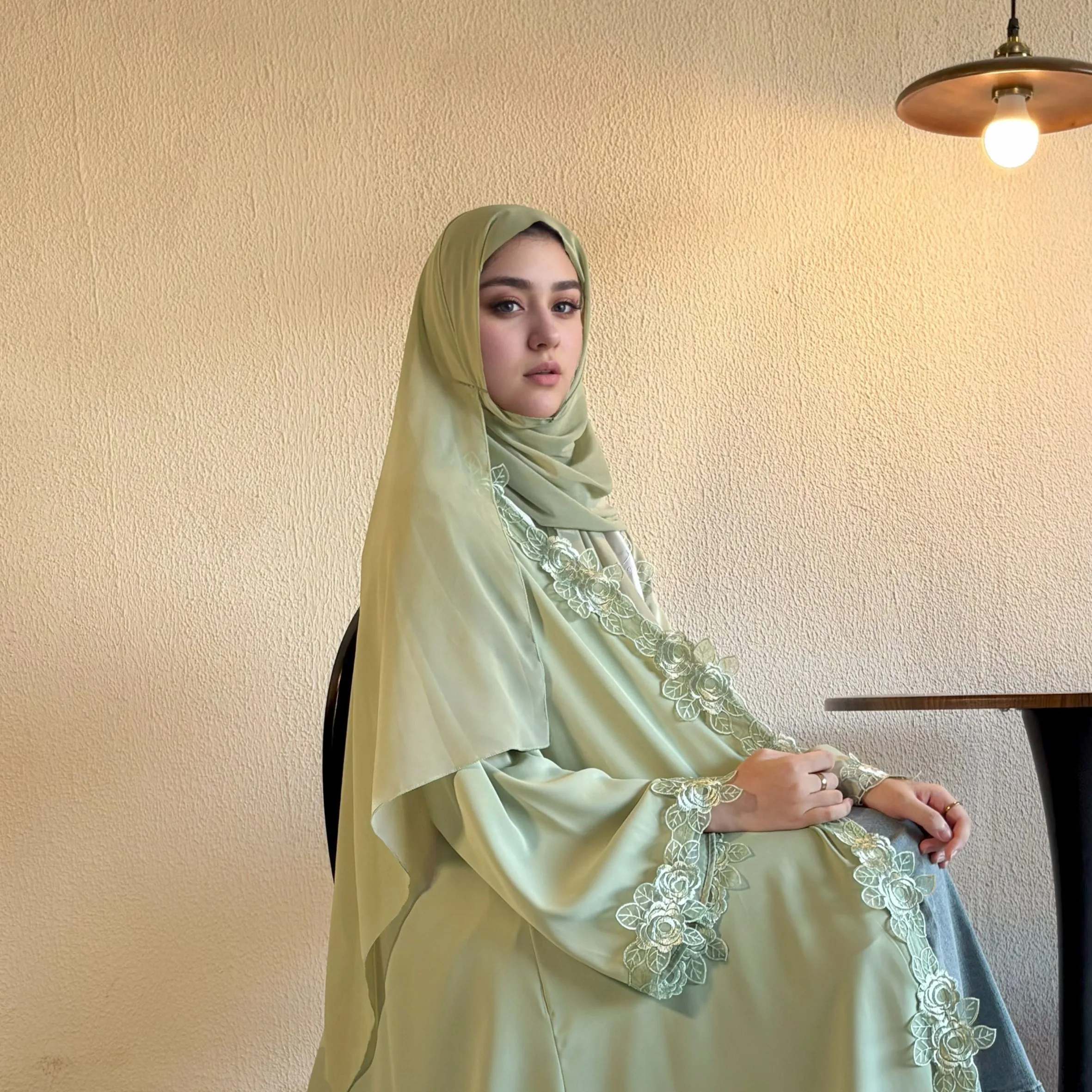 Soft Sage Green Abaya Set with 3D Lace Rose Embroidery